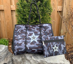 camo star print neoprene tote bag- organizer bag inside