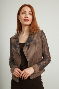 brown moto jacket w prt coll/sleeve-213964